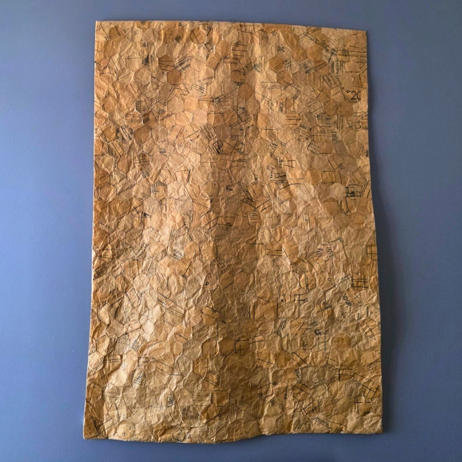 Once the layered papers had dried, the real meditation began: hand-cutting hundreds of individual hexagonal shapes. Each piece needed to be cut with precision, following the lines I'd created through the layered patterns. I found myself falling into a rhythm—the soft sound of scissors through paper, the gentle flex of my fingers, the growing pile of geometric shapes beside me.