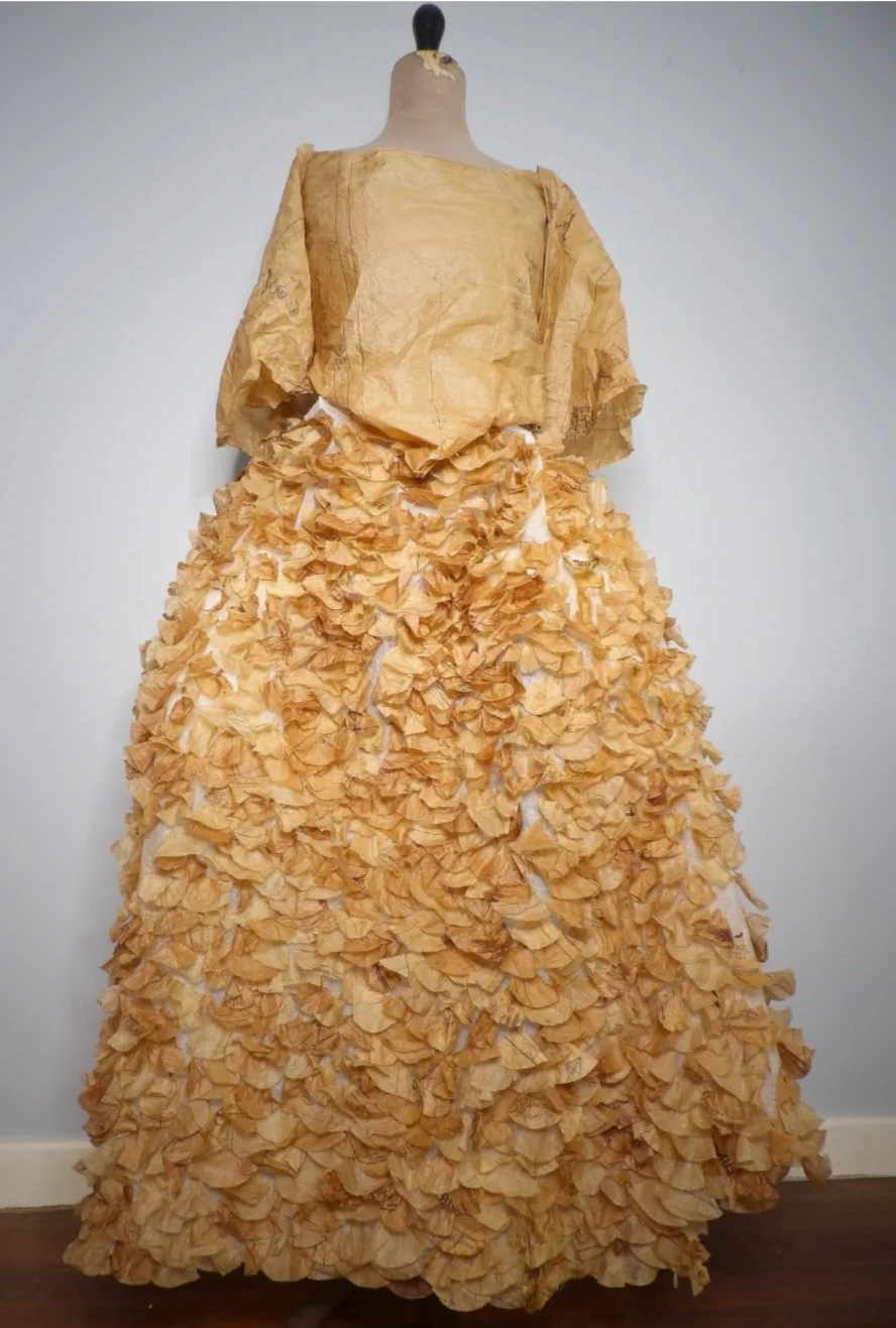 The skirt presented a particular challenge—large pieces of dyed paper simply wouldn't hold together. Rather than abandon my vision, I found inspiration in Impressionist painting techniques. Just as artists like Monet created cohesive images through small dabs of color that the eye blends together, I decided to build my skirt from smaller elements.